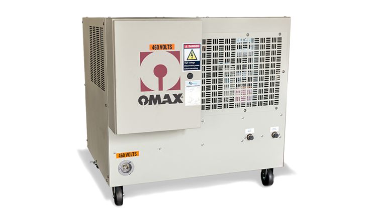 為了讓水刀提高使用效率和運作穩定性, 進入水泵的水必須是恒定的冷水. OMAX 的氣冷式冷水器能提供溫度穩定的冷水, 有助水泵密封圈的壽命, 維持更長的生產. OMAX對設備為環境帶來的影響有強烈警覺, 所以OMAX的冷水機采用R407c制冷劑, 一種環保的制冷劑, 不會破壞臭氧層。制冷能力更高的冷水機能無縫連接OMAX的水循環系統, 顯著減低整體用水量。